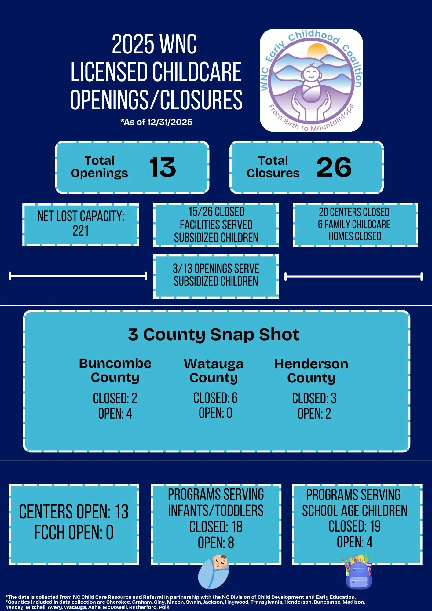 Using data from NC Childcare Resource and Referral, WNC Early Childhood Coalition has completed a 2025 data study of program closures and openings in WNC. Please click on picture above to see a full snapshot infographic of the highlighted statistics.